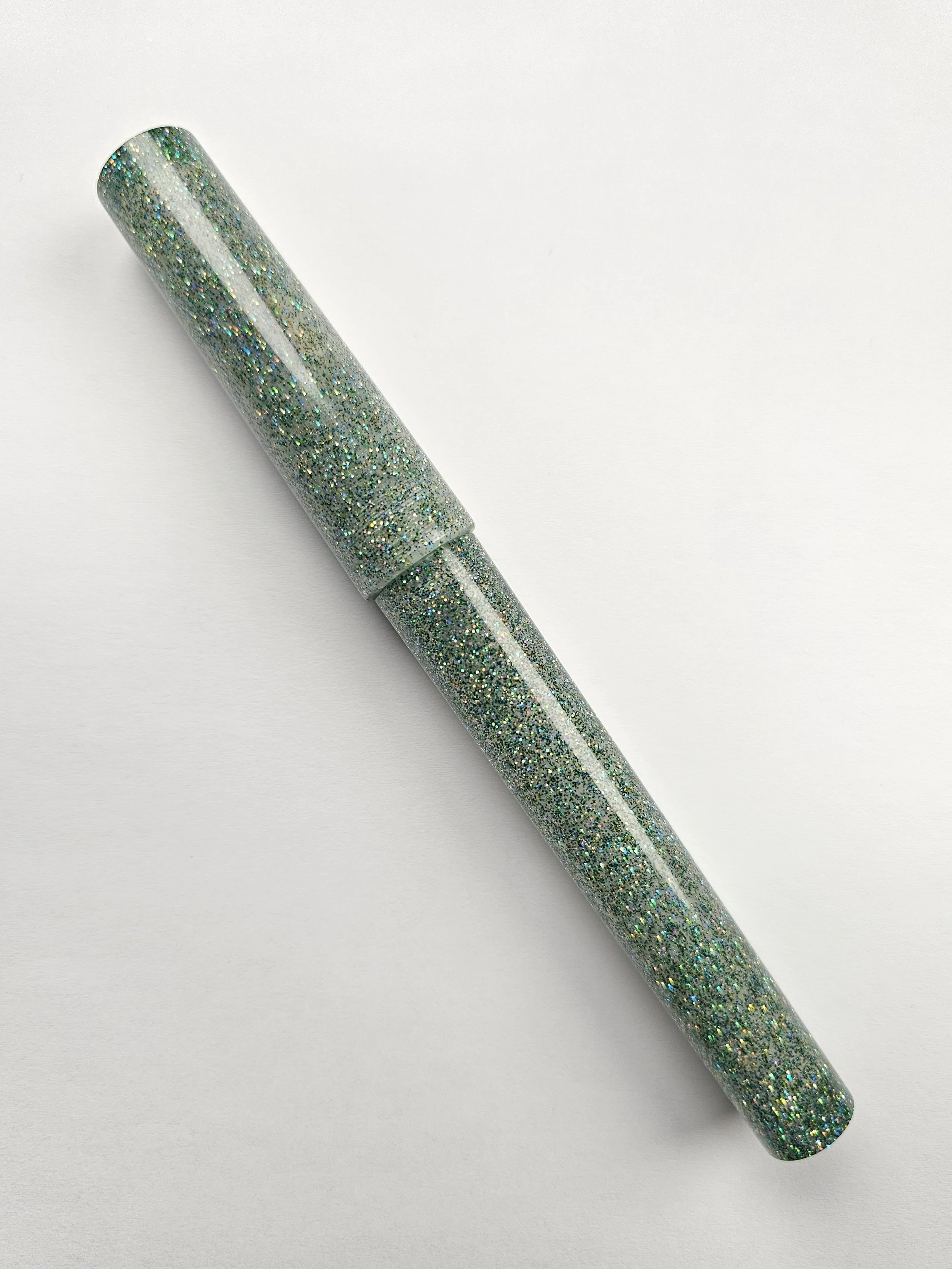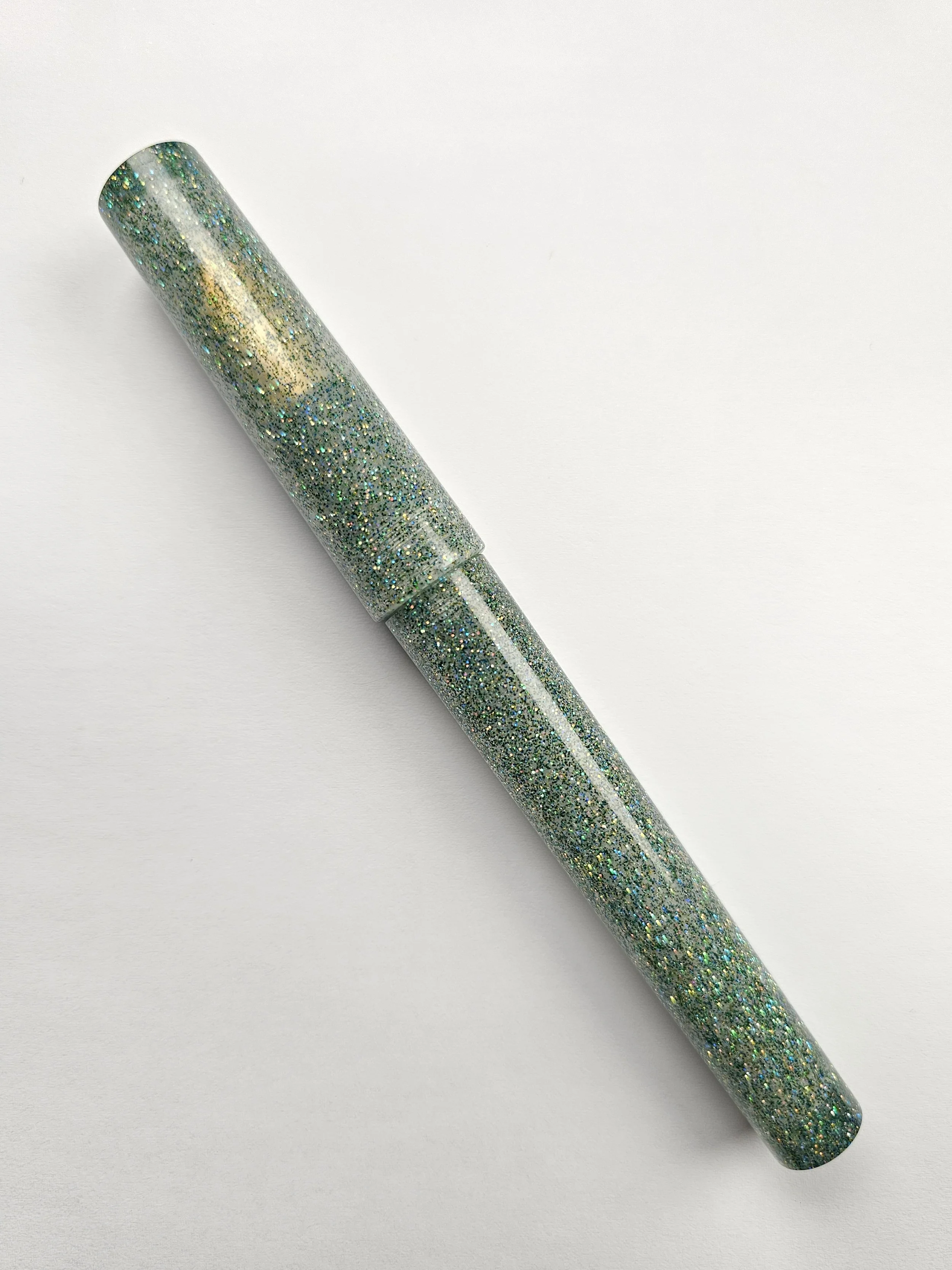 A mix of glitter with a green tint, slightly translucent. Some internal tool marks visible.