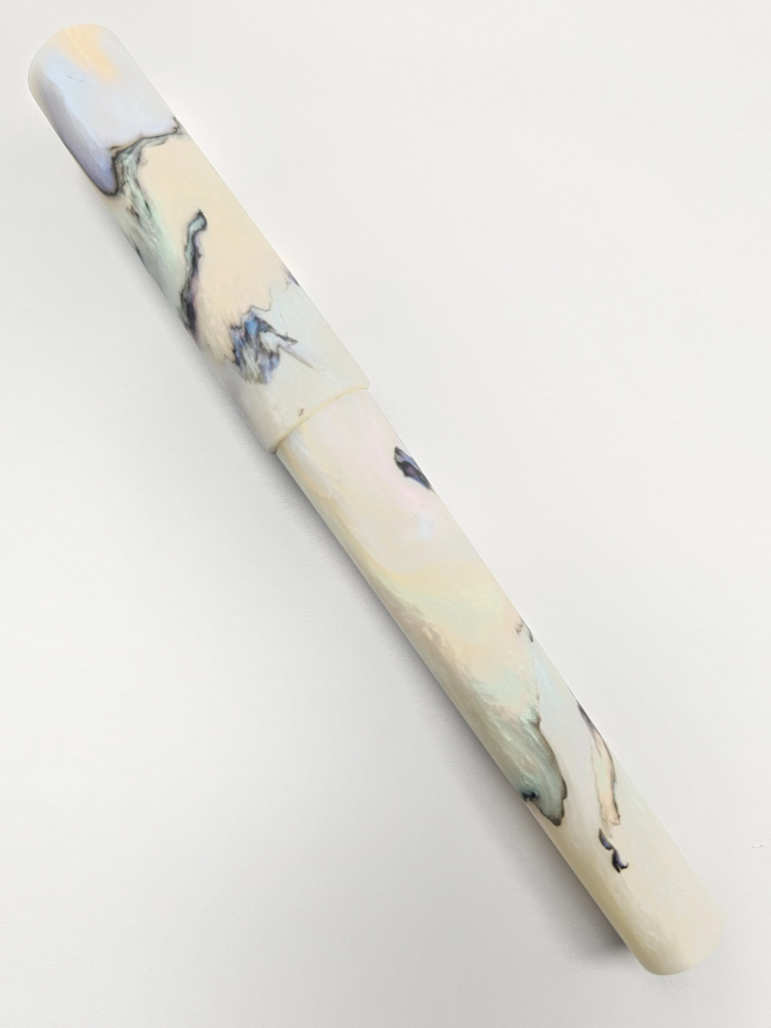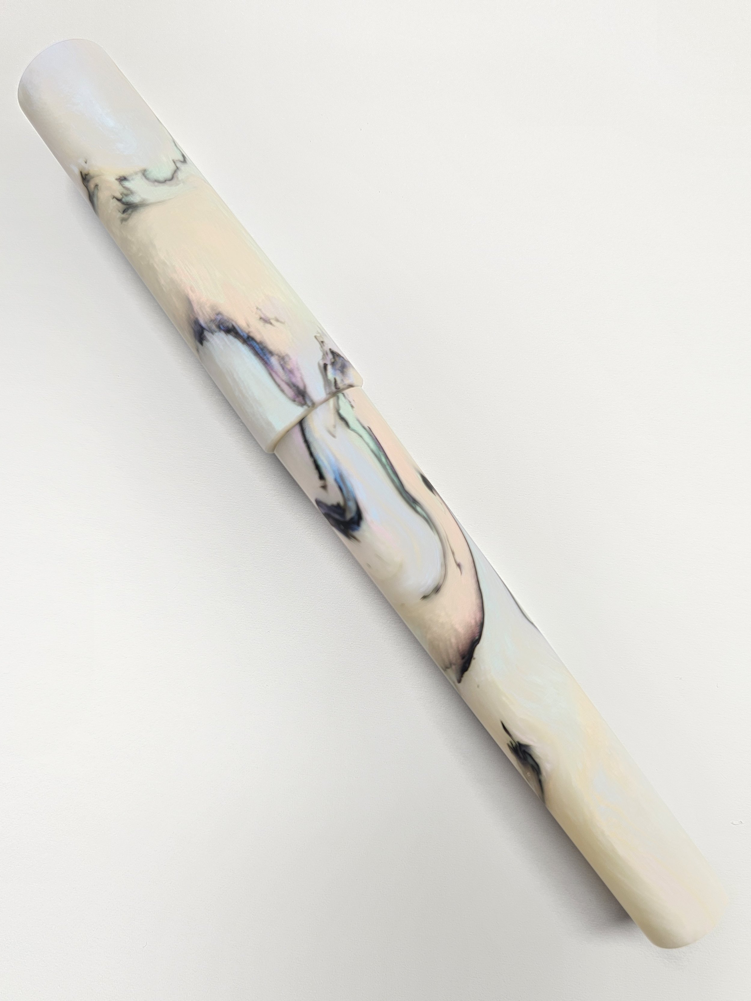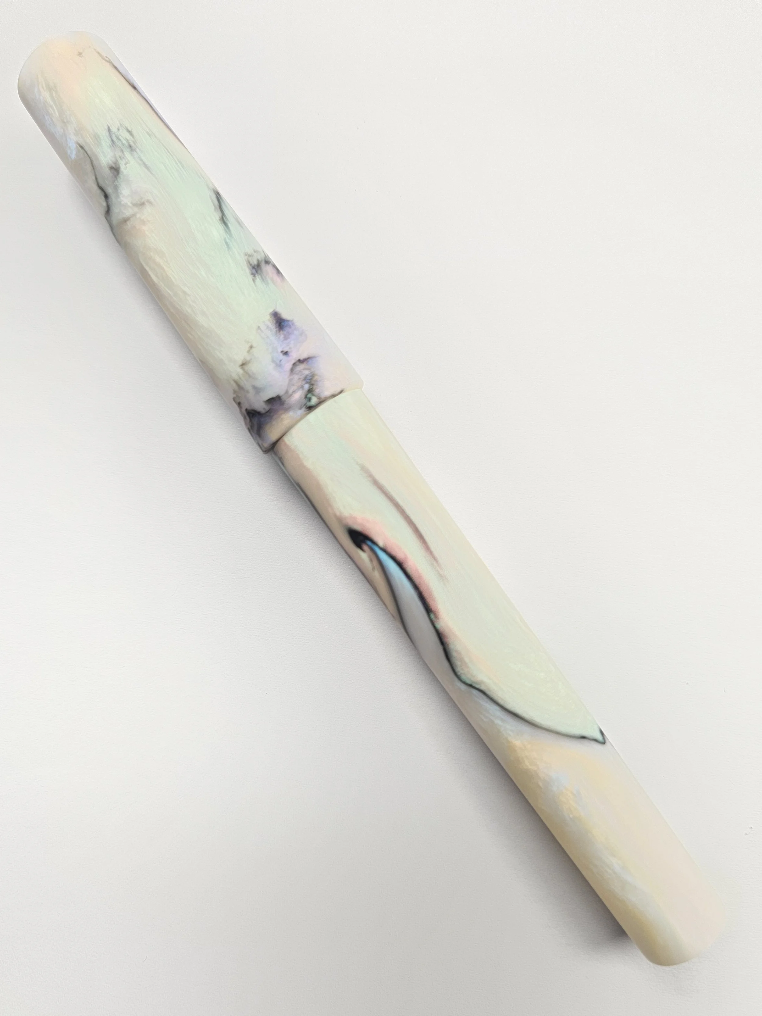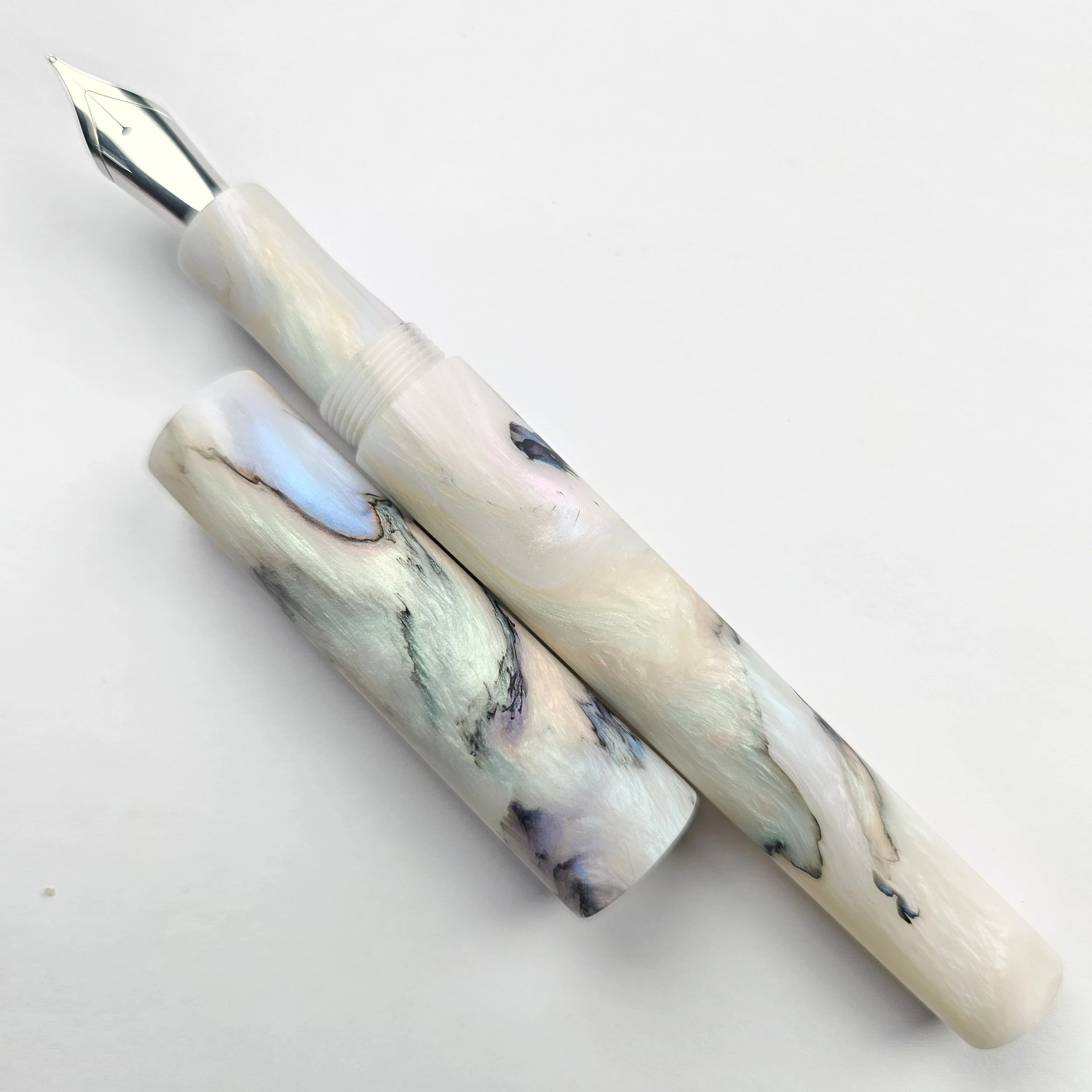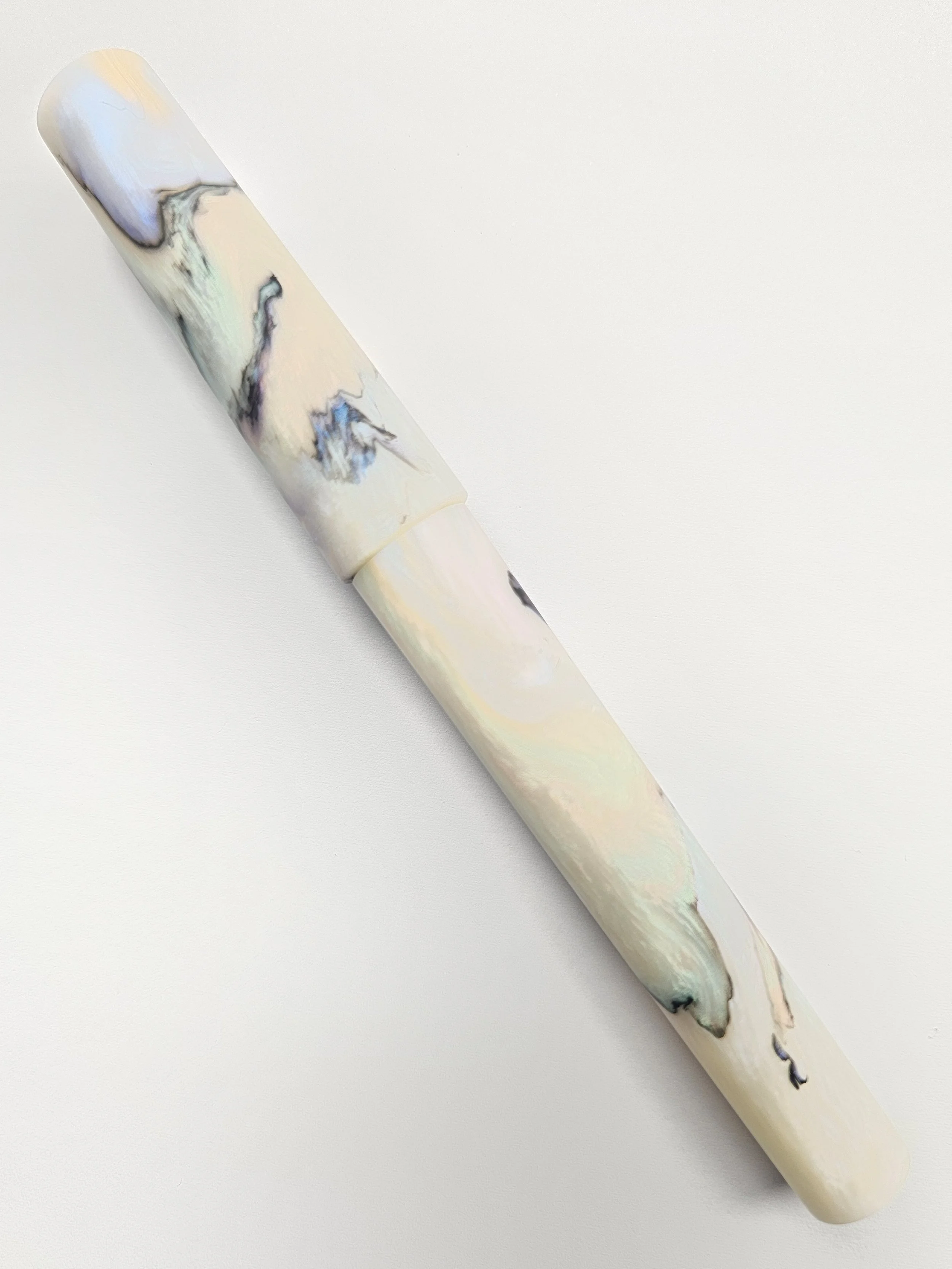 This is a twist on the very popular Papillion Light material, same mix of colours just less black mixed through. The white sections are a rainbow pearly white which looks amazing in person.